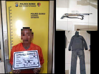 Dengan dipimpin langsung oleh Kasat Reskrim Polres Dumai AKP Aris Gunadi, S.I.K, M.H dan Kanit Tipidum Sat Reskrim Polres Dumai Ipda Andri Saputra, S.E, M.M, tim Garuda Polres Dumai berhasil membekuk seorang pelaku JL (43) yang merupakan bagian dari komplotan bersenjata tersebut pada Jumat (08/10/2021) dikediamannya yang terletak di Dusun Rantau Ahmad RT. 003 RW. 008 Kelurahan Sungai Segajah Kecamatan Kubu Kabupaten Rokan Hilir, Provinsi Riau.