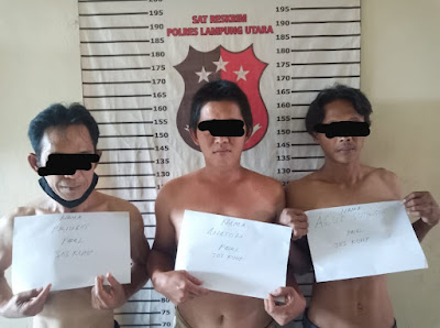 AKP Eko memaparkan di tempat kejadian perkara (TKP) petugas mengamankan tiga orang terduga pelaku yakni AS (24) warga Kelurahan Cempedak Kecamatan Kotabumi Kota, AN (31) warga jalan Inpres Gang Cengkeh Kelapa Tujuh dan PR (57) warga Kelurahan Kota Gapura Kecamatan Kotabumi Kota.
