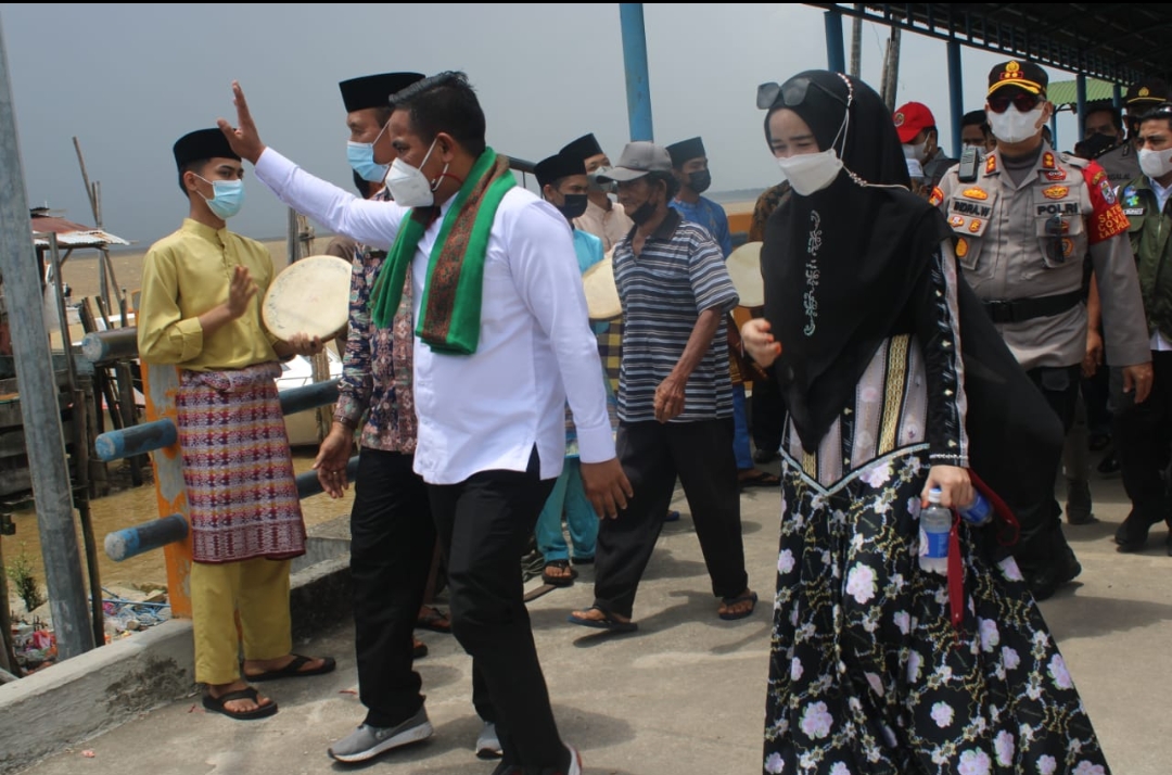 Bupati Pelalawan bersama rombongan tiba di dermaga Kelurahan Teluk Dalam pukul 11.30 WIB menggunakan speedboat dan disambut langsung oleh Camat Kuala Kampar berserta masyarakat Kuala Kampar