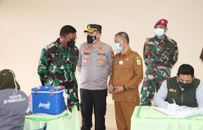 Lingga (Harian.co) — Kapolres Lingga AKBP Arief Robby Rachman SH,SIK,MSi bersama Danpuslatpurmar 9 Dabo Singkep MAYOR MAR Adid Kurniawan Wicaksono, M.Tr.Opsla, Sekda Kabupaten Lingga Syamsudi, S.Pd, Kadinkes PPKB Kabupaten Lingga Abdul Mulkan Azima melakukan Peninjauan kegiatan vaksinasi oleh TNI/Polri bersama Pemkab kabupaten Lingga di Kecamatan Singkep Kabupaten Lingga, Senin (23/08/2021).
