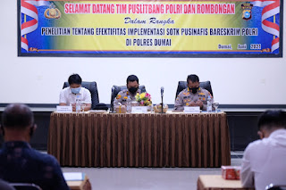 DUMAI (Harian.co) — Tim Pusat Penelitian dan Pengembangan (Puslitbang) Polri laksanakan Penelitian Tentang Efektifitas Implementasi Sistem Organisasi Tata Kerja (SOTK) Pusinafis Bareskrim Polri, Selasa (08/06/2021) di Gedung Citra Waspada Polres Dumai.