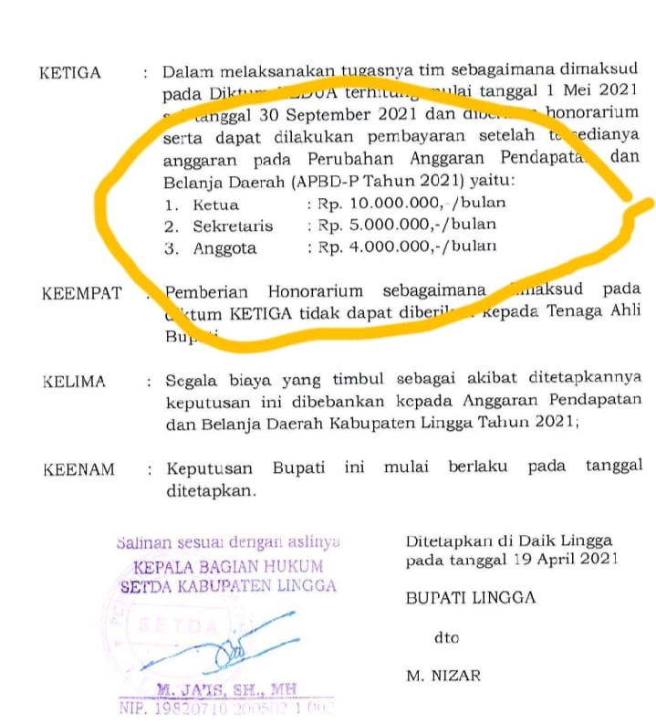 Nilai yang dialokasikan pun cukup fantastis, mencapai ratusan juta rupiah, hal itu terkakulasi sejak dikeluarkannya Surat Keputusan (SK) Bupati Lingga Nomor : 252/KPTS/IV/2021 tanggal 19 April 2021, bahwa terhitung mulai tanggal 1 Mei 2021 sampai dengan 30 September 2021 atau 5 Bulan kerja, Tim diberikan Honorium.