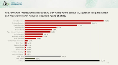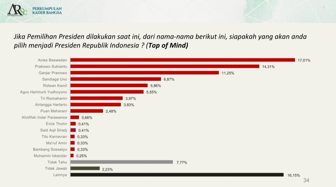 Rilis survei ini dihadiri antara lain oleh Ketua Perkumpulan Kader Bangsa Dimas Oky Nugroho, Ph.D, Kepala Badan Pemenangan Pemilu DPP PD Andi Arief, Ketua Bappilu Partai Golkar Maman Abdurahman, Ketua DPP Partai Nasdem Saan Mustopa dan anggota F-PDIP DPR RI Rieke Dyah Pitaloka. (*)