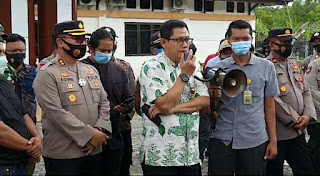 Kajari Simeulue, R. Harry Wibowo, SH, MH, yang menemui mahasiswa di depan kantor Kejaksaan juga Didampingi Kapolres AKBP Agung Surya Prabowo. S. I. K. Berterimakasih kepada mahasiswa Simeulue yang masih peduli terhadap Simeulue.