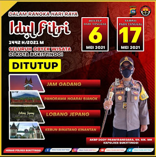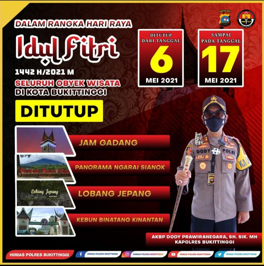 Bukittinggi (Harian.co) — Kapolres Bukittinggi AKBP Dody Prawiranegara, S.H., S.I.K., M.H memastikan penutupan tempat wisata pada Idul Fitri 1442 H/2021 M. Beberapa tempat wisata yang ditutup diantaranya: Jam Gadang, Panorama Ngarai Sianok, Lobang Japang, dan Kebun Binatang Kinantan mulai dari 6 Mei s.d 17 Mei 2021.