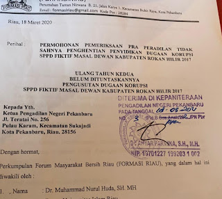 Dalam penjelasannya Dr. Huda mengatakan, “Ya benar hari ini (18/03/2021) jam 15.15 Wib proses pendaftaran sudah kami daftarkan terkait “Ulang Tahun Kedua Belum Dituntaskannya Pengusutan Dugaan Korupsi SPPD FIKTIF Masal Dewan Kabupaten Rokan Hilir 2017 dan sudah Diterima di Kepaniteraan PN Pekanbaru,” Pungkasnya.