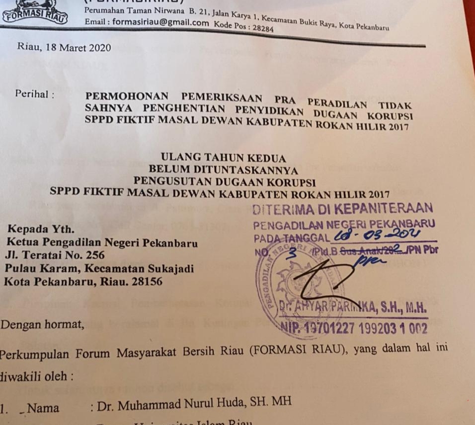 Sebagaimana terkonfirmasi awak media bahwa, Perkumpulan Forum Masyarakat Bersih Riau (FORMASI RIAU), yang diwakili oleh Dr. Muhammad Nurul Huda, SH. MH., pendiri Perkumpulan Forum Masyarakat Bersih Riau (FORMASIRIAU) hari ini, Kamis (18/03/2021) sekira pukul 15.15 Wib di PN Pekanbaru, Riau telah mendaftarkan gugatan “Permohonan Pemeriksaan Pra Peradilan Tidak Sahnya Penghentian Penyidikan Dugaan Korupsi SPPD FIKTIF Masal Dewan Kabupaten Rokan Hilir 2017.”