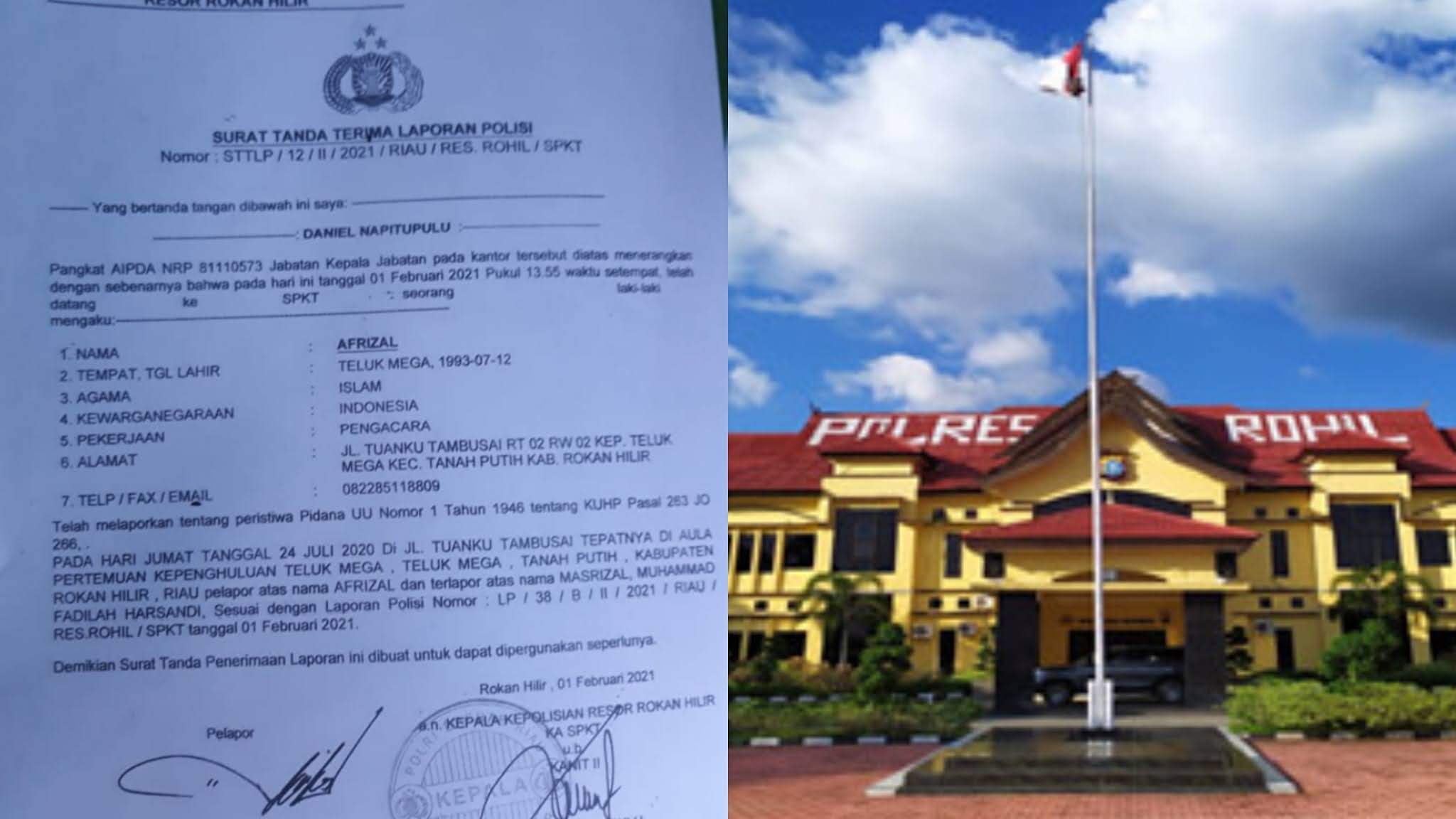Dugaan perbuatan pemalsuan surat autentik yang digunakan Terlapor (MR) sebagai bukti pemenuhan syarat calon penghulu Teluk Mega Kecamatan Tanah Putih Kabupaten Rokan Hilir-Riau, dilaporkan Afrizal SH selaku pihak yang merasa dirugikan dalam pemilihan Penghulu serentak se-Kabupaten Rohil pada tahun 2020 lalu.
